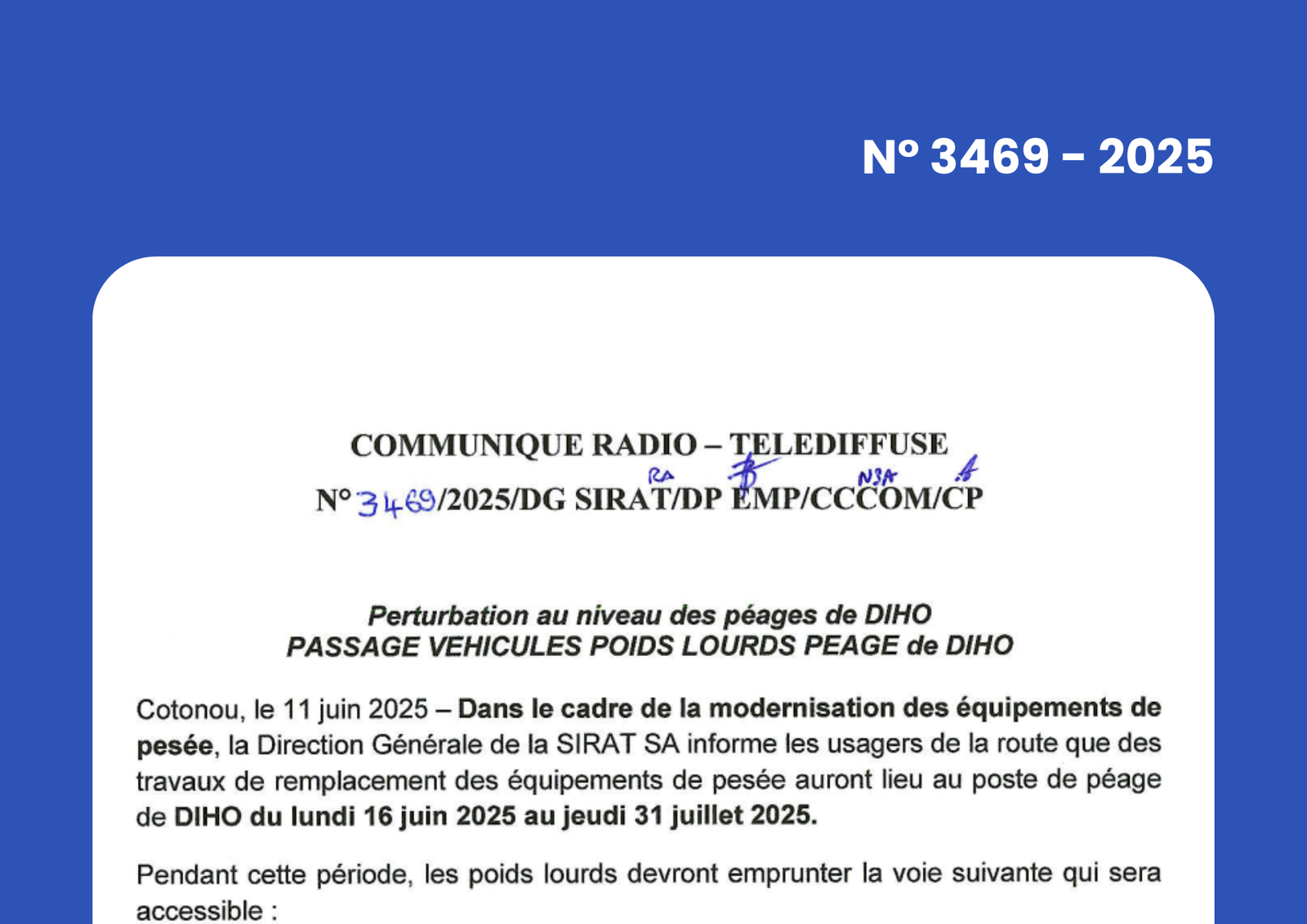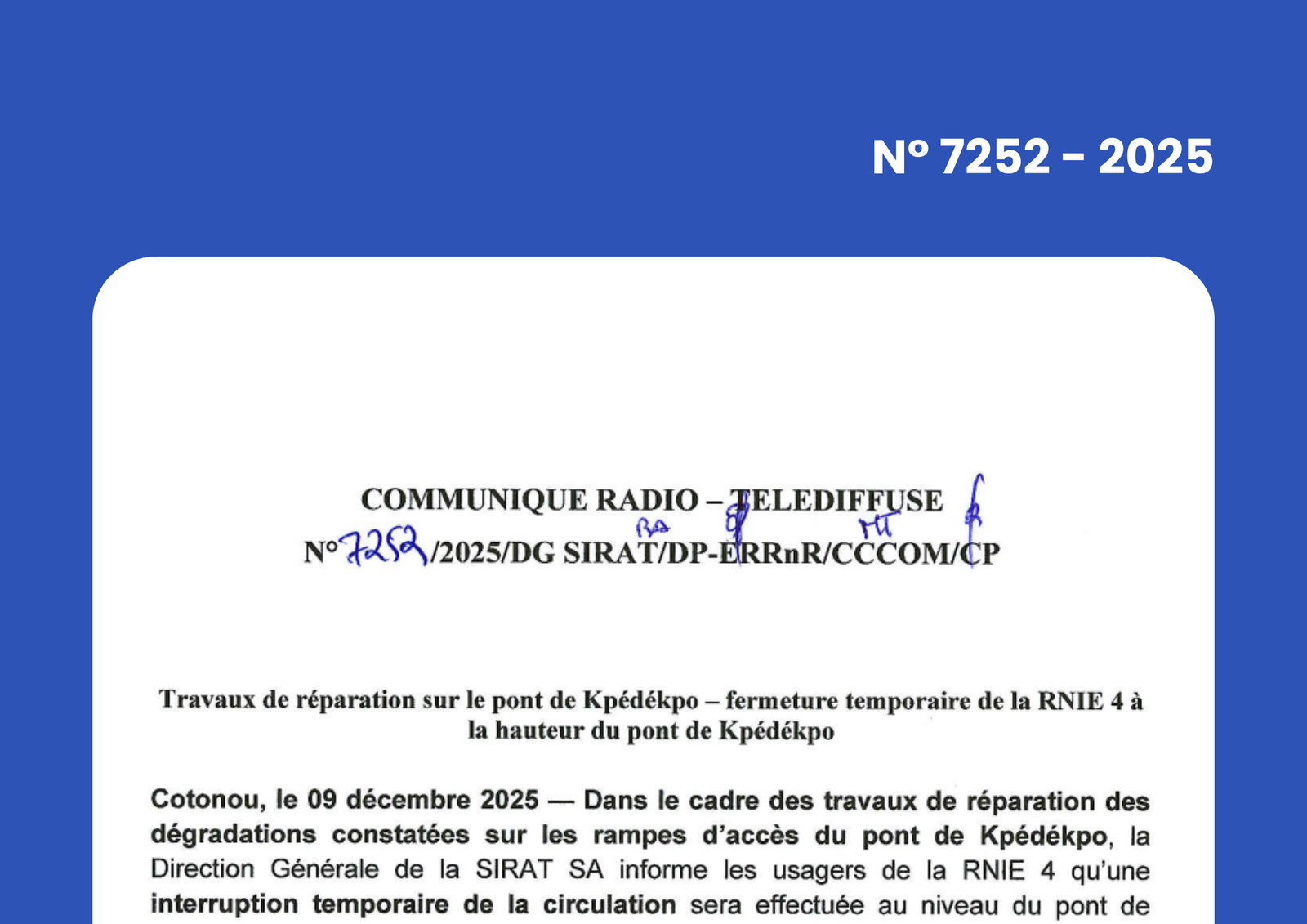 Communiqué SIRAT- Travaux de réparation sur le pont de Kpédékpo - Fermeture temporaire de la RNIE 4 à la hauteur du pont de kpédékpo
