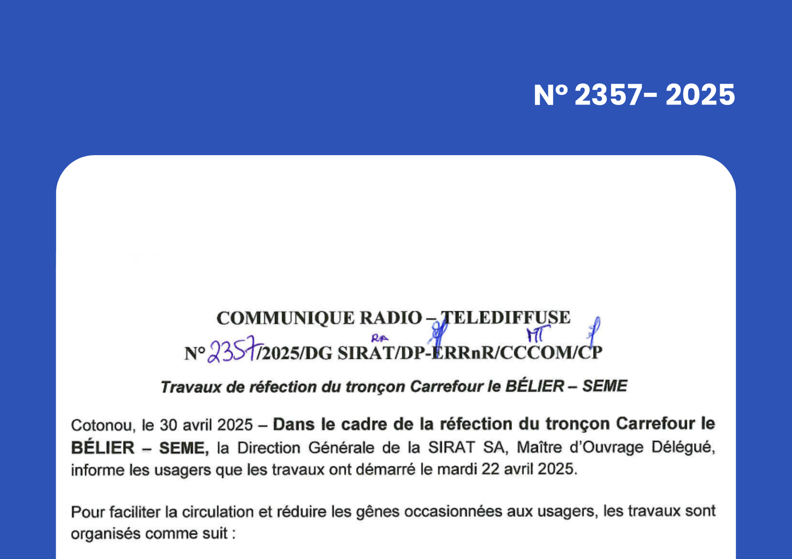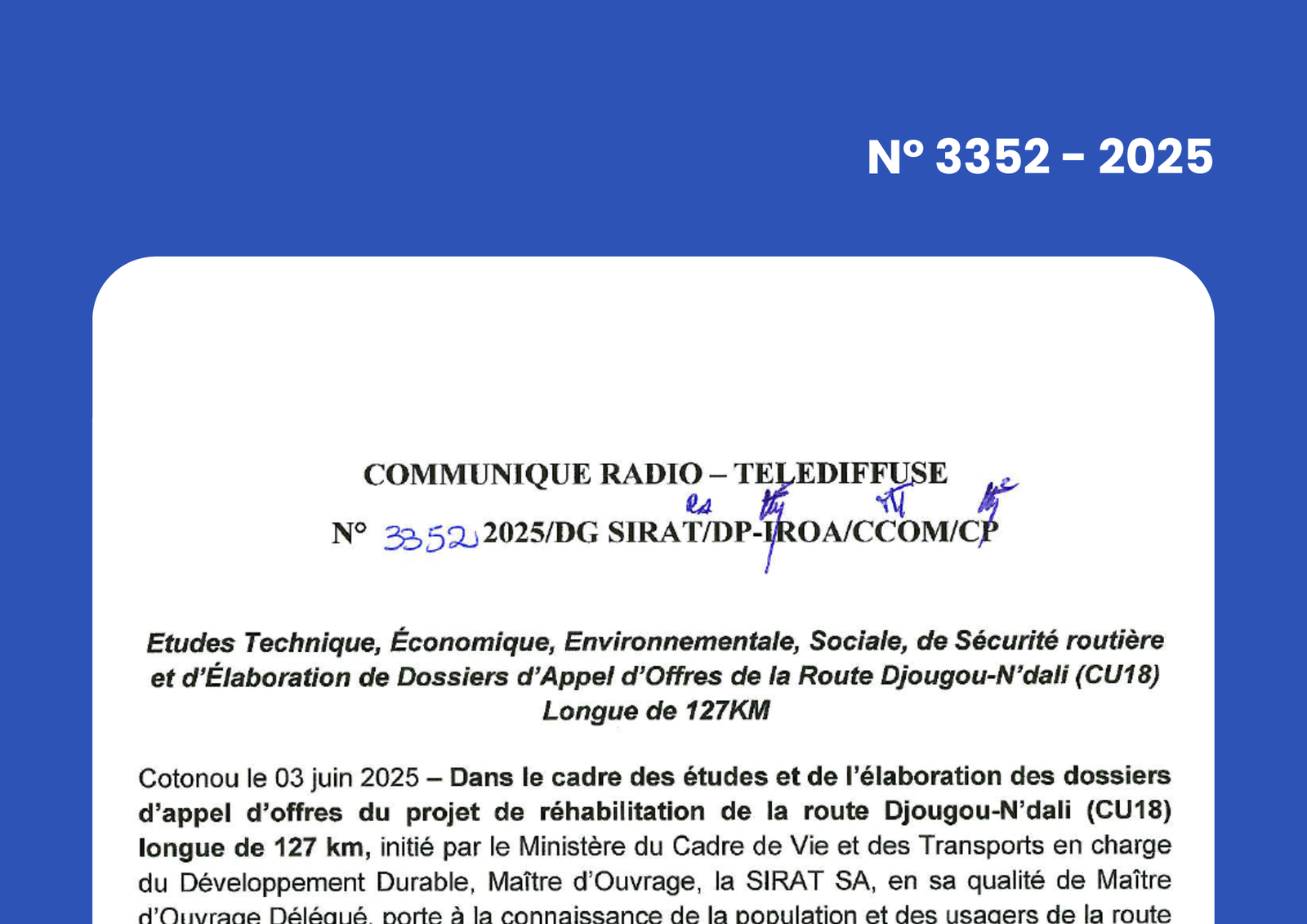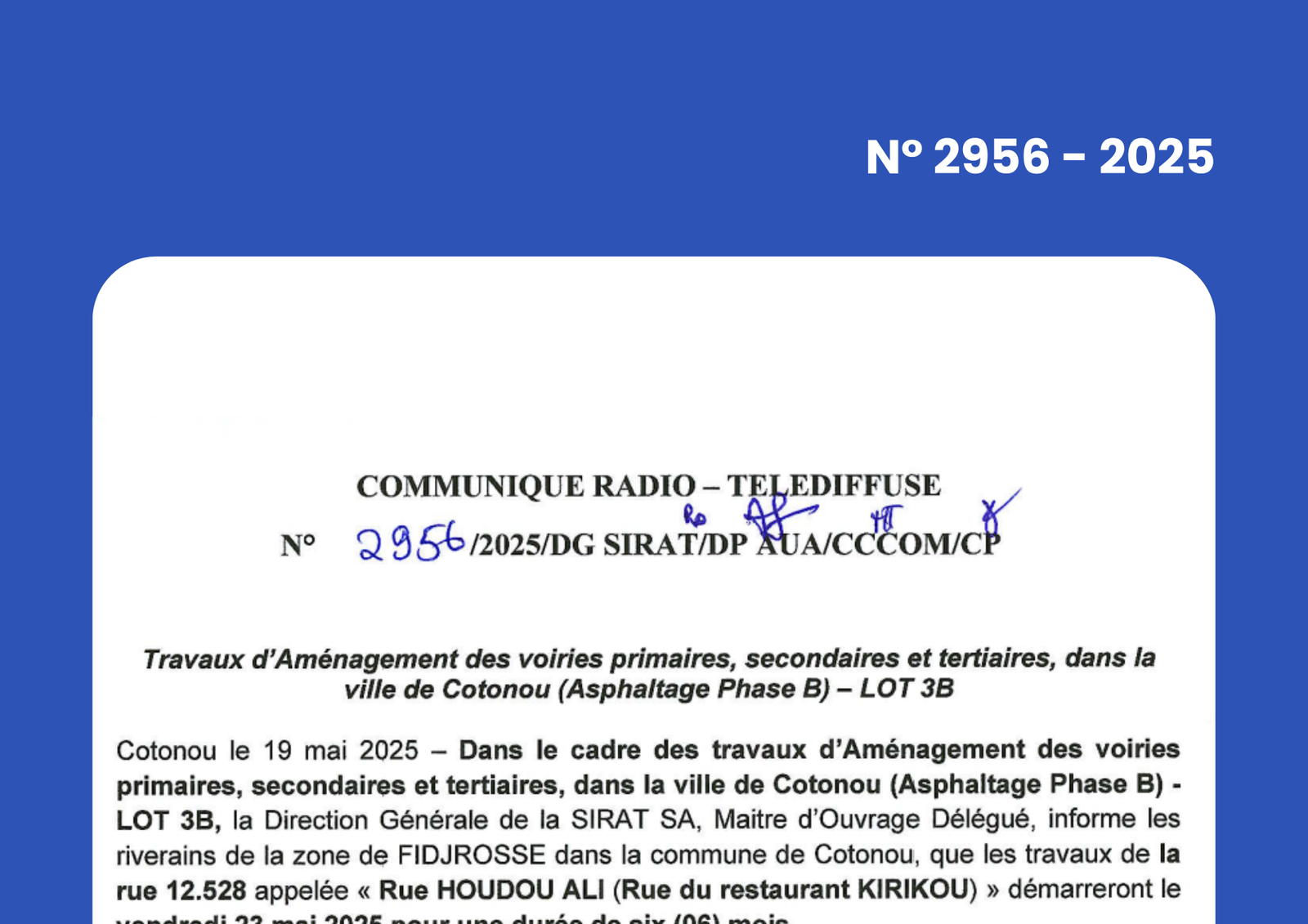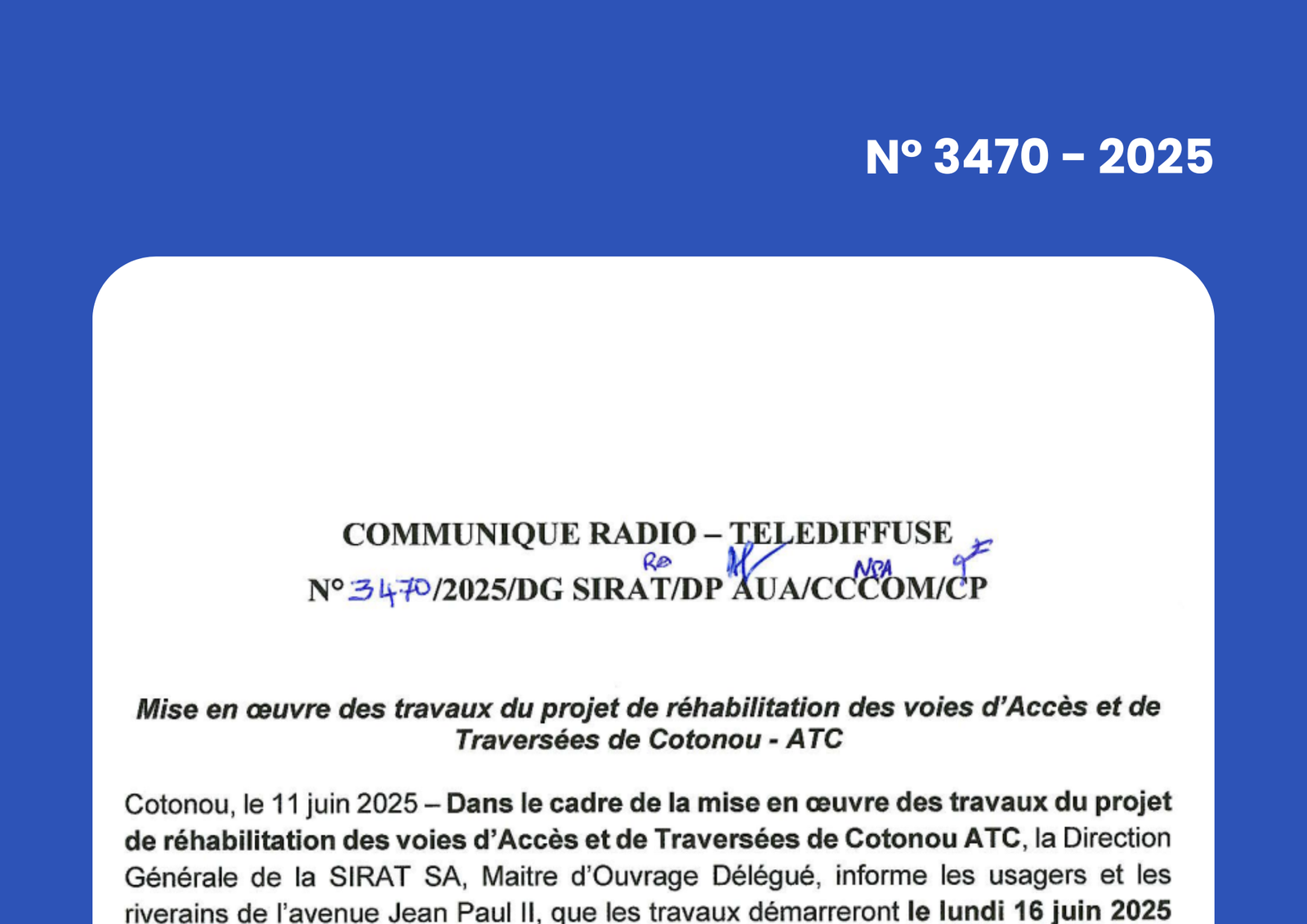 Communiqué : Réhabilitation des voies d'Accès et de Traversées de Cotonou (ATC)
