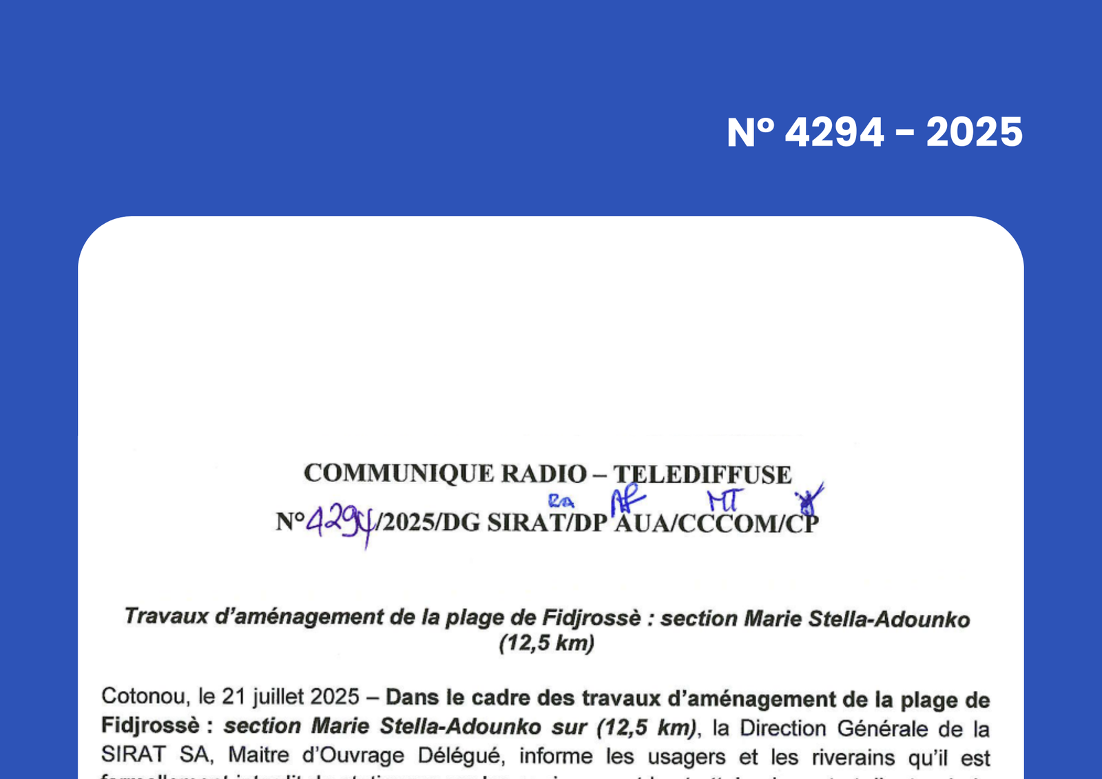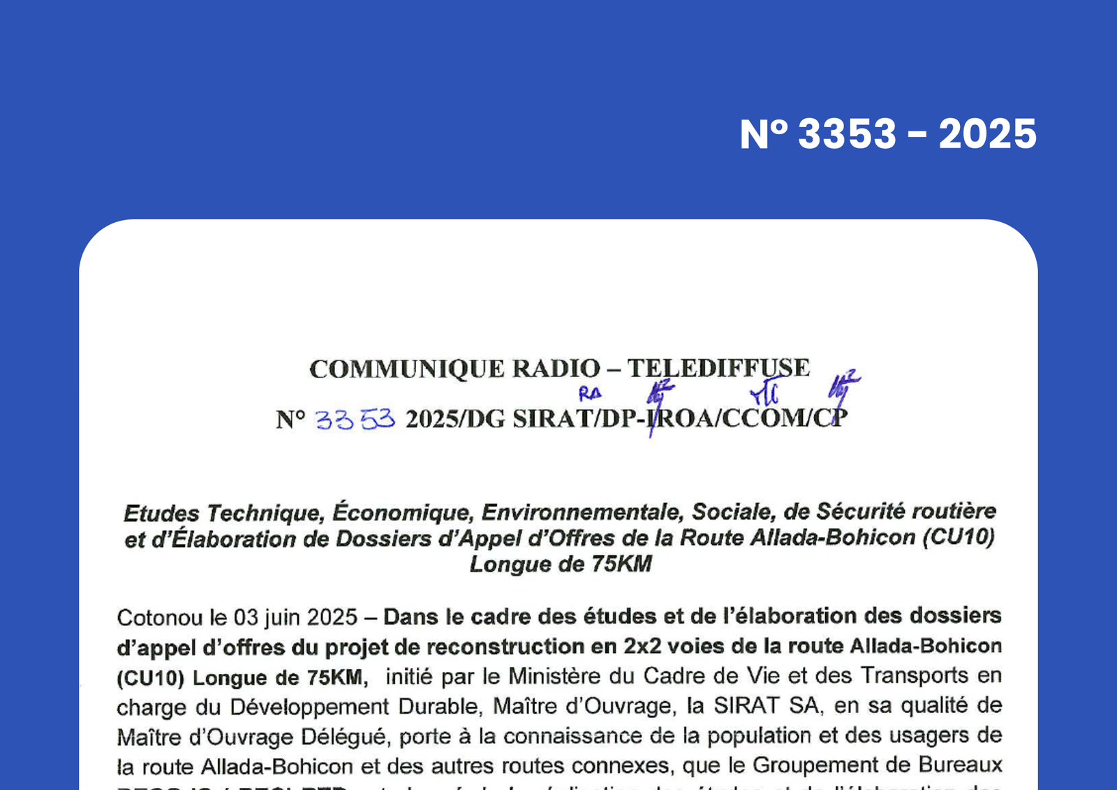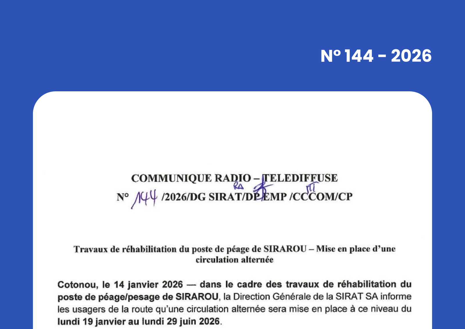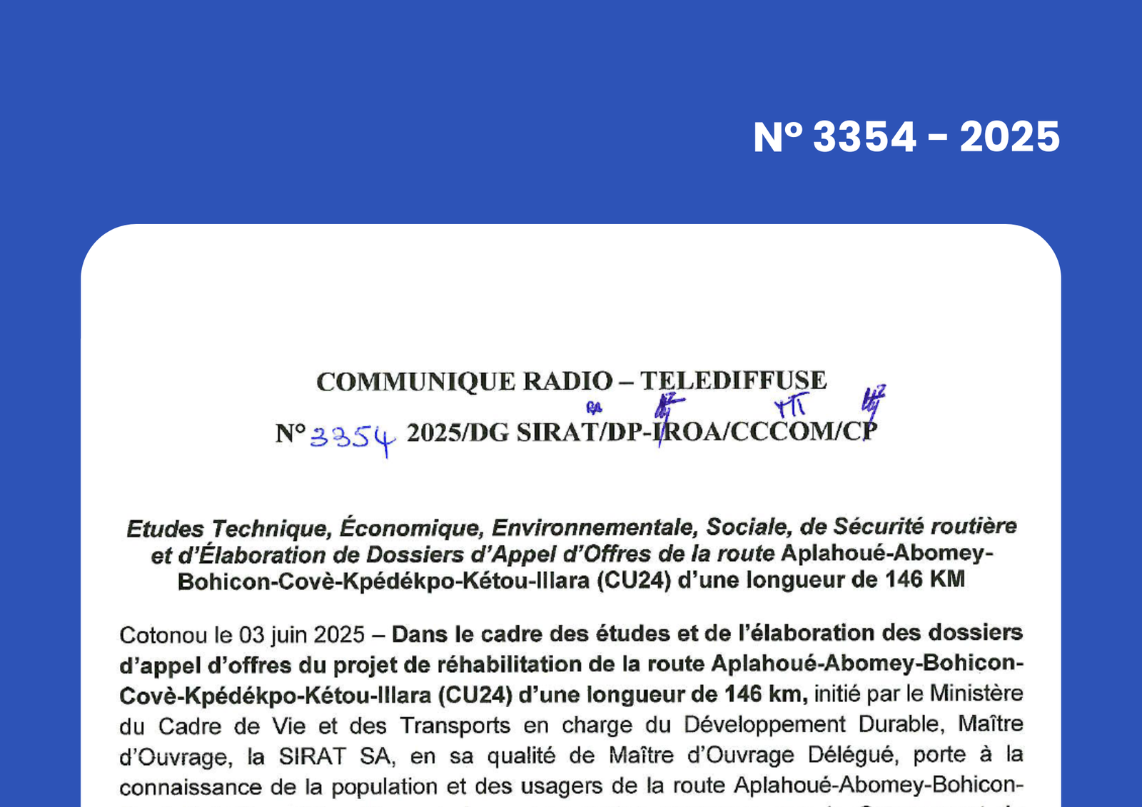 Communiqué : Réhabilitation des voies d'Accès et de Traversées de Cotonou (ATC)