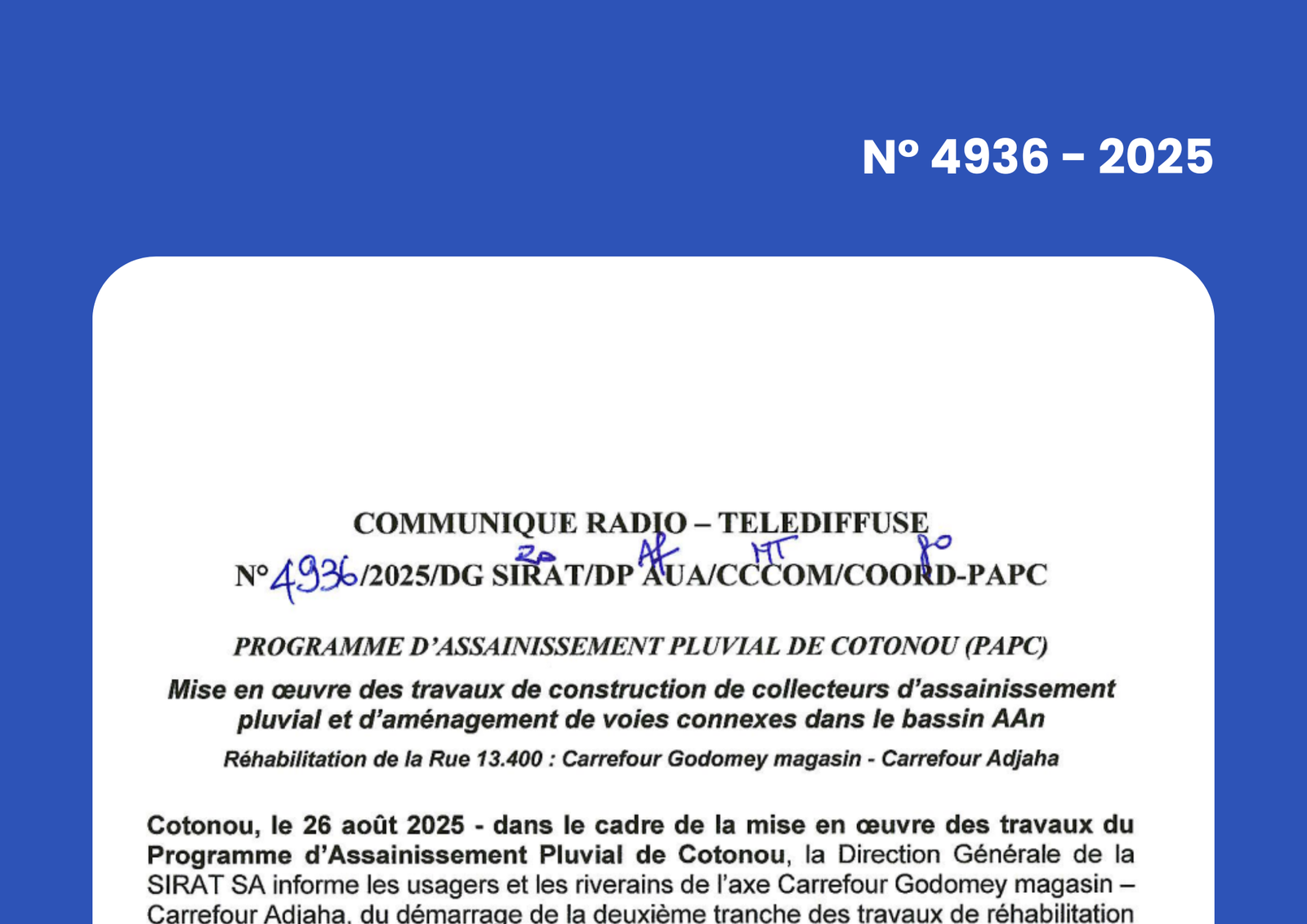 Communiqué : Programme d'assainissement pluvial de Cotonou (PAPC)