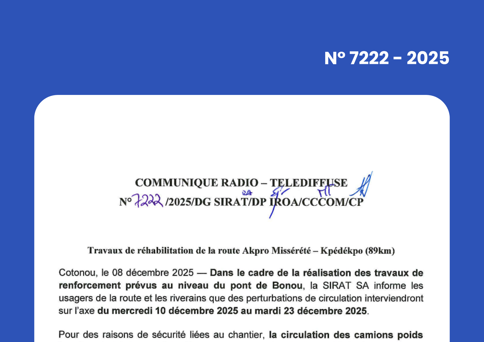 Communiqué : Travaux de réhabilitation de la route Akpro Missérété – Kpédékpo (89km) Cotonou : Dans le cadre de ..