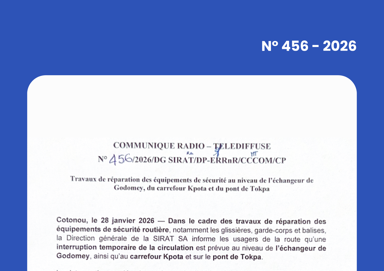 Communiqué : Travaux de réparation des équipements de sécurité au niveau de l'échangeur de Godomey, du carrefour Kpota et ...